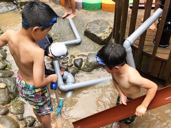 園庭の小川で水遊び。ガシャガシャポンプを使って水を上手く利用する子どもたち。